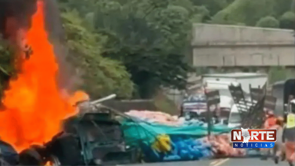 El hecho involucró a una buseta de servicio público de pasajeros de la empresa Velotax, con placas KUM-169, que colisionó de manera violenta contra un tractocamión. Tras el impacto, el vehículo de carga explotó y se produjo un incendio de gran magnitud que envolvió a ambos automotores, generando una densa columna de humo visible desde varios puntos de la carretera.
