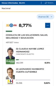 Por su parte, en la Consulta de las Soluciones, que agrupó a sectores del centro político, la vencedora fue Claudia López Hernández, quien superó a su rival Leonardo Huerta y aseguró su lugar como candidata presidencial de esa coalición.