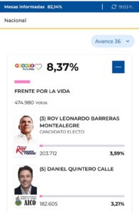 En la consulta del bloque de izquierda denominada Frente por la Vida, el ganador fue Roy Barreras Montealegre, quien obtuvo la mayor votación dentro de su coalición y avanzará como candidato de ese sector político en la carrera presidencial.