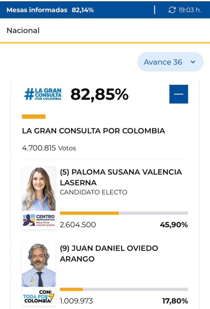 En la denominada Gran Consulta por Colombia, correspondiente al sector de centroderecha, la ganadora fue Paloma Valencia Laserna, quien obtuvo la mayor votación frente a otros aspirantes de ese bloque político. Con este resultado, se convierte en la candidata de ese sector para disputar la Presidencia de la República.