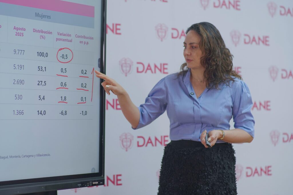 El Departamento Administrativo Nacional de Estadística (DANE) informó que la Tasa de Desocupación (TD) para el total nacional en agosto de 2025 fue del 8,6%, lo que representa una disminución estadísticamente significativa de 1,1 puntos porcentuales (p.p.) frente al mismo mes del año anterior (9,7%). Es la tasa de desocupación más